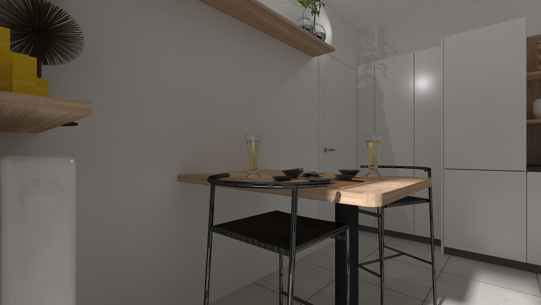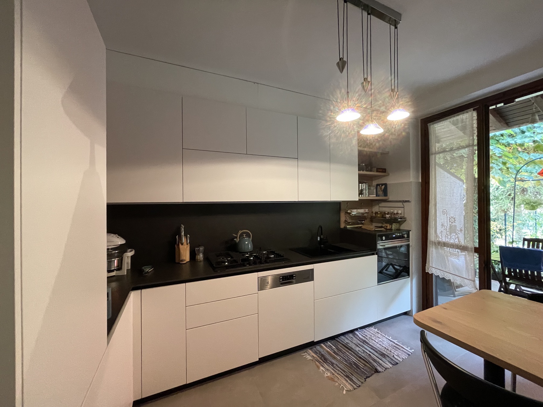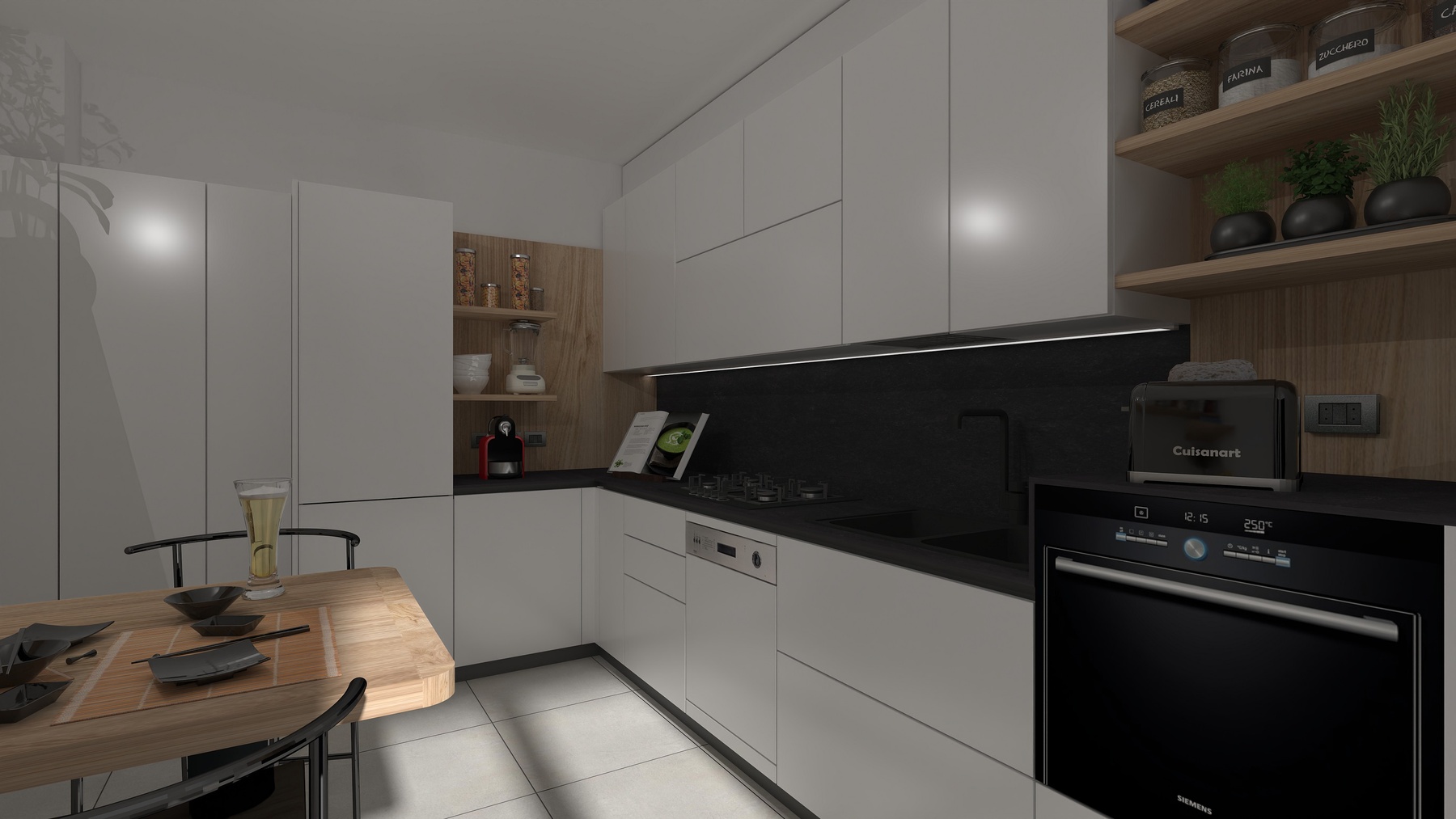 La cucina viene realizzata con basi e pensili in altezza maxi, frontali e fianchi a vista in finitura laccato opaco bianco, gole e zoccoli in alluminio nero.